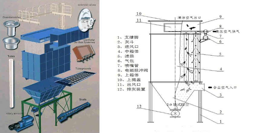 脈沖布袋除塵器由灰斗、上箱體、中箱體、布袋(根據(jù)煙氣溫度不同,可采用PTFE、P84等高性能復(fù)合布袋)、清灰噴吹裝置等部分組成。工作時,高溫?zé)煔庥苫叶飞系倪M(jìn)風(fēng)口流入灰斗,由于重力沉降作用,粗塵粒直接落入灰斗底部,起到預(yù)收塵的作用,同時氣流速度變慢,輕微粉塵隨氣流轉(zhuǎn)折向上進(jìn)入中箱體,粉塵被高溫濾袋過濾阻留,積附在濾袋外表面,過濾后的氣體透過濾袋進(jìn)入上箱體至出風(fēng)口,經(jīng)引風(fēng)機(jī)排至大氣。積附在濾袋外壁的粉塵不斷增加,當(dāng)達(dá)到設(shè)定時間,脈沖控制儀順序間隔觸發(fā)開啟脈沖電磁閥,使壓縮空氣包內(nèi)的壓縮空氣經(jīng)噴吹管對各排濾袋進(jìn)行脈沖噴吹清灰,使濾袋在瞬間急劇膨脹抖落積附在濾袋外壁的粉塵,從濾袋上剝離的粉塵沉降至灰斗,經(jīng)過卸灰閘閥排出,除塵效率≥99%,適應(yīng)于各種除塵行業(yè)。