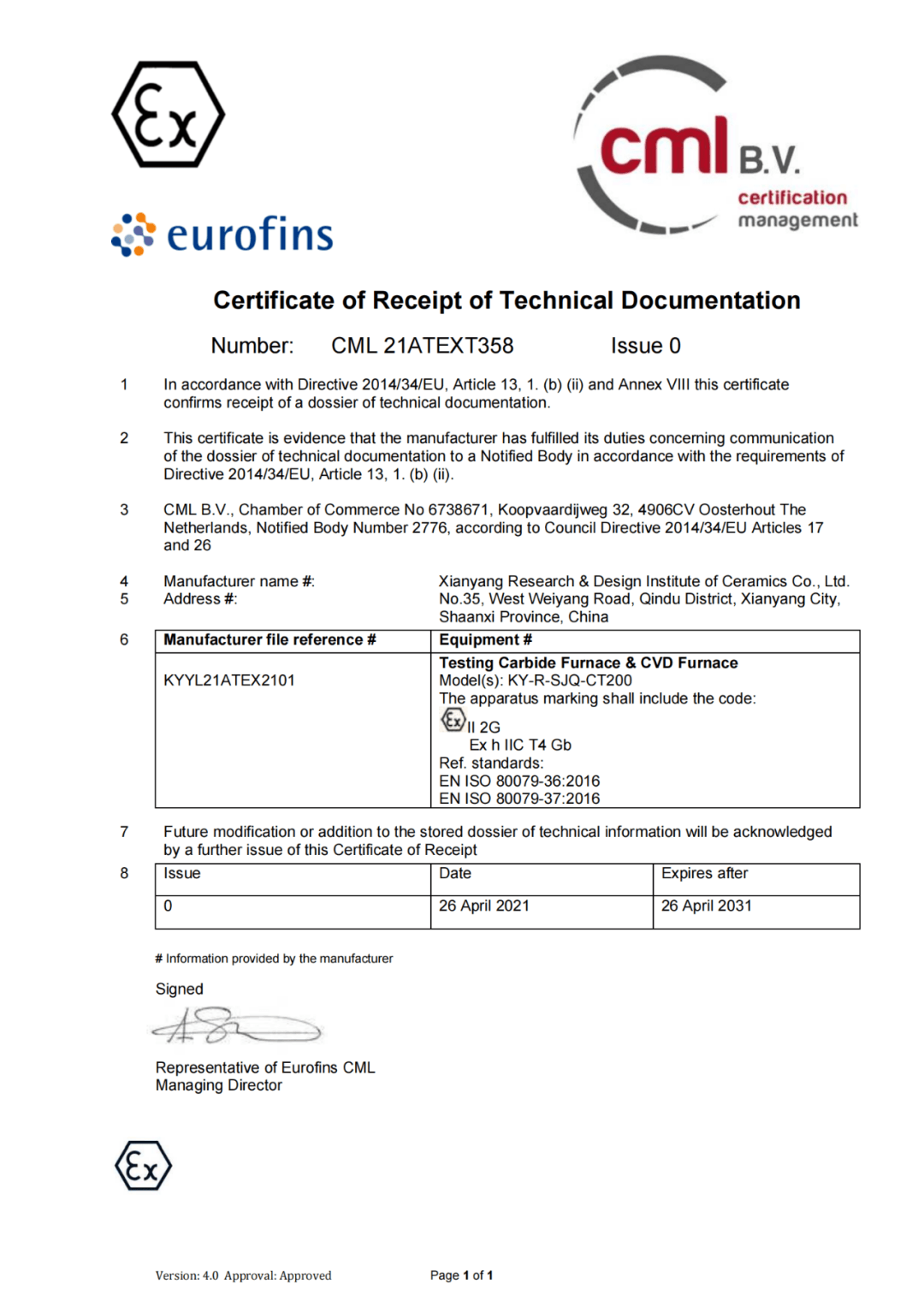 4月26日,歐陸(Eurofins)集團(tuán)向咸陽陶瓷院頒發(fā)了氣相沉積CVD實(shí)驗(yàn)爐ATEX防爆認(rèn)證書,這是中國首個(gè)碳化和化學(xué)氣相沉積實(shí)驗(yàn)爐系統(tǒng)的防爆ATEX證書,標(biāo)志著我國國內(nèi)碳化和化學(xué)氣相沉積設(shè)備在硅碳材料行業(yè)的設(shè)計(jì)安全水平跨入到了全新的歷史階段,已達(dá)到國際安全設(shè)計(jì)水準(zhǔn)。