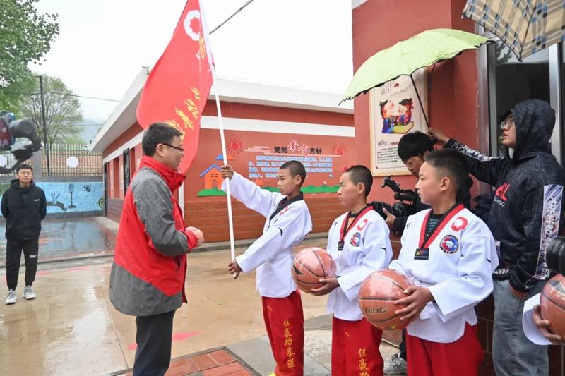 最后,大家前往中國(guó)建材楊嶺希望小學(xué)看望師生,中國(guó)建材咸陽(yáng)陶瓷院駐楊嶺村支部書(shū)記雷先鋒利用自身特長(zhǎng),開(kāi)設(shè)跆拳道班,為學(xué)生教授跆拳道。院黨委書(shū)記王華代表咸陽(yáng)陶瓷院向中國(guó)建材楊嶺希望小學(xué)贈(zèng)送學(xué)習(xí)用品、體育用品以及跆拳道服等,并向跆拳道班的成立授旗,希望學(xué)生“文明其精神,野蠻其體魄”,讓精神文明和健康體魄一起茁壯成長(zhǎng)。最后,楊嶺希望小學(xué)教師代表為我院贈(zèng)送牌匾。