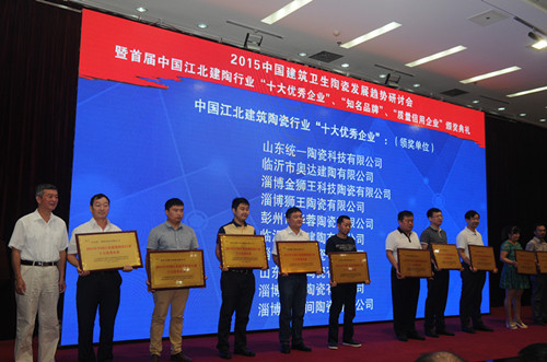 9月5日,2015中國建筑衛(wèi)生陶瓷發(fā)展趨勢研討會暨首屆中國江北建陶行業(yè)“十大優(yōu)秀企業(yè)”、“知名品牌”、“質(zhì)量信用企業(yè)”頒獎典禮在淄博市淄川區(qū)人民禮堂召開。本次活動由中國建筑衛(wèi)生陶瓷協(xié)會陶瓷板分會、國家陶瓷及衛(wèi)浴產(chǎn)品中小企業(yè)服務(wù)示范平臺主辦。中國建筑衛(wèi)生陶瓷協(xié)會常務(wù)副會長繆斌,秘書長呂琴,中共淄博市委常委市委政法委書記韓國祥,淄川區(qū)區(qū)委書記楊洪濤、區(qū)長李新勝,咸陽陶瓷研究設(shè)計院院長梁振海及全國各地建陶產(chǎn)區(qū)企業(yè)代表、專家、學(xué)者和獲獎單位代表300余人參加了本次研討會暨頒獎典禮。 淄博市淄川區(qū)區(qū)委書記楊洪濤為大會致辭,中國建筑衛(wèi)生陶瓷協(xié)會副秘書長、陶瓷板分會秘書長徐波介紹了分會工作,與會專家、企業(yè)代表進(jìn)行了交流互動。 會上對2015首屆中國江北建筑陶瓷行業(yè)“十大優(yōu)秀企業(yè)”、“知名品牌”、“質(zhì)量信用企業(yè)”進(jìn)行了表彰和頒獎。山東統(tǒng)一陶瓷科技有限公司、臨沂市奧達(dá)建陶有限公司等10家企業(yè)被評為2015首屆中國江北建筑陶瓷行業(yè)“十大優(yōu)秀企業(yè)”,“瓦倫蒂諾”、“米羅印象”等20個陶瓷品牌被評為2015首屆中國江北建筑陶瓷行業(yè)“知名品牌”,淄博獅王陶瓷有限公司、沈陽新王者陶瓷有限公司等20家企業(yè)被評為2015首屆中國江北建筑陶瓷行業(yè)“質(zhì)量信用企業(yè)”。 (獲獎企業(yè)名單見附件)